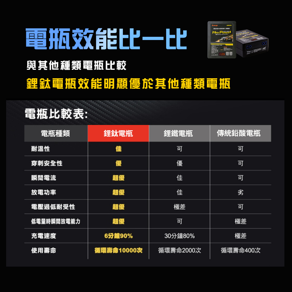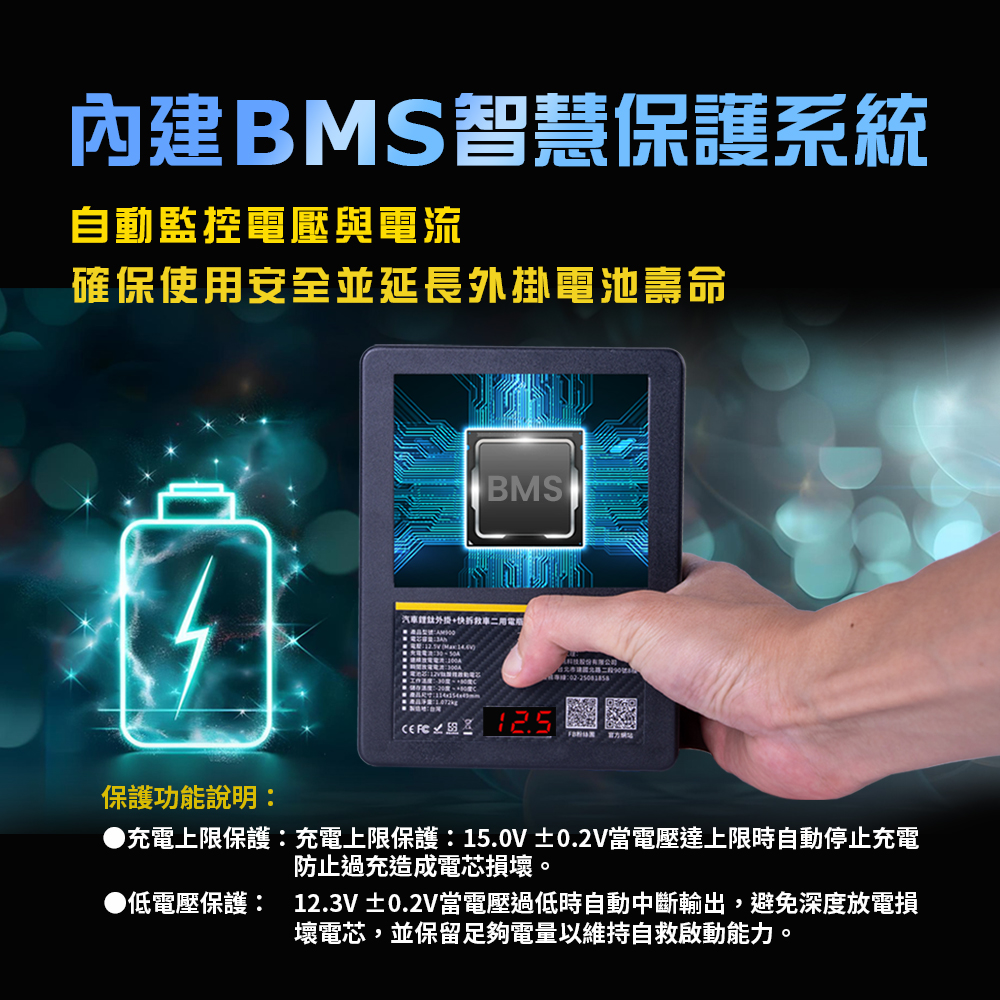 ➤ 日本鋰鈦電芯 耐高低溫,三年保固,台灣製造 ➤ 延長汽車電瓶壽命 降低啟動負擔,增強啟動效能 ➤ 快拆救車線 支援汽油 3000cc、柴油 2200cc(含) 以下車款 ➤ 內建BMS智慧保護電路+80A保險絲雙重防護 ➤ 首創快速插拔 安裝簡單迅速,操作更直覺 ➤ 全車電源穩定 延長車用電子設備壽命 ➤ 點火效能提升 優化燃燒效率,降低積碳 ➤ 超低自放電 長時間閒置也能保有電力,環保節能 ➤ 電壓檢測功能 可即時監控電瓶狀態 ➤ 隨附配件 電瓶連接線+緊急救車線