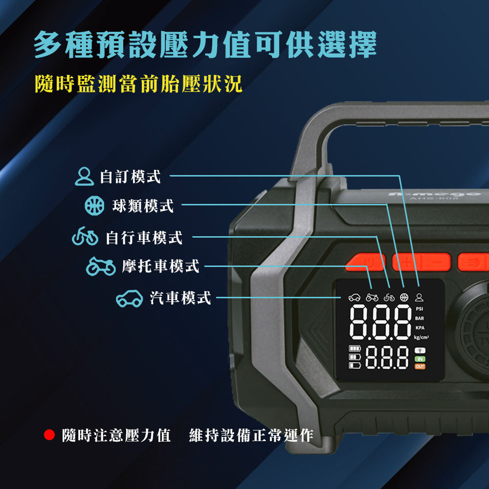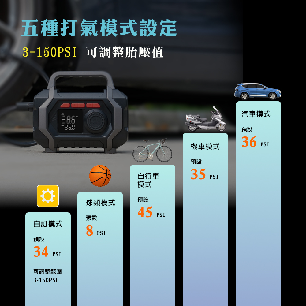 ➤ 打氣機功能:鋁合金 19mm 氣缸,支援緊急快速補氣 多種預設模式(汽車、機車、自行車、籃球),最高可達 150 PSI