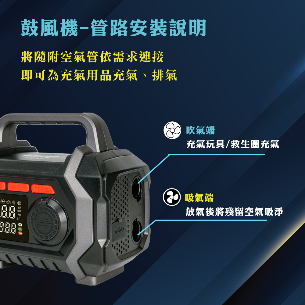 ➤ 六合一 救車、打氣、抽氣、吹氣、照明、充電 一機搞定