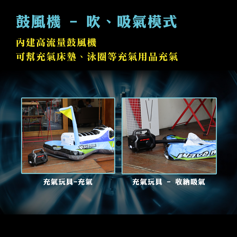➤ 內建高流量鼓風機,隨附多款氣嘴,可用於充氣床墊、泳圈等