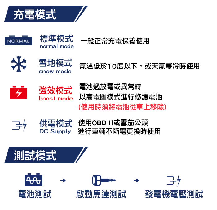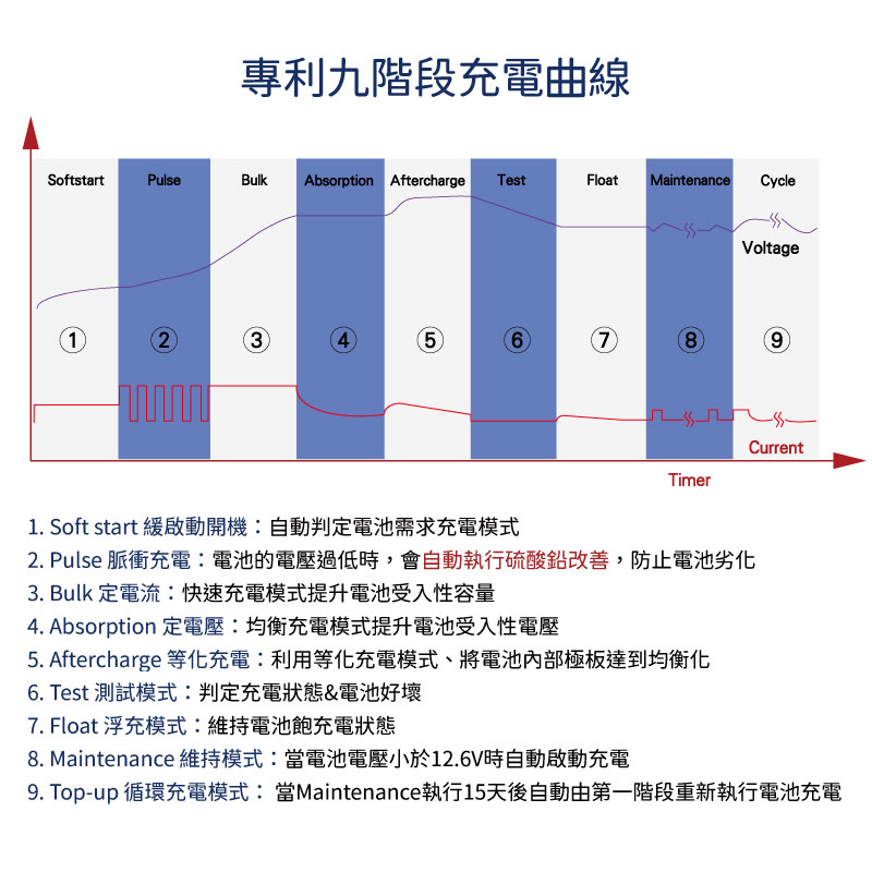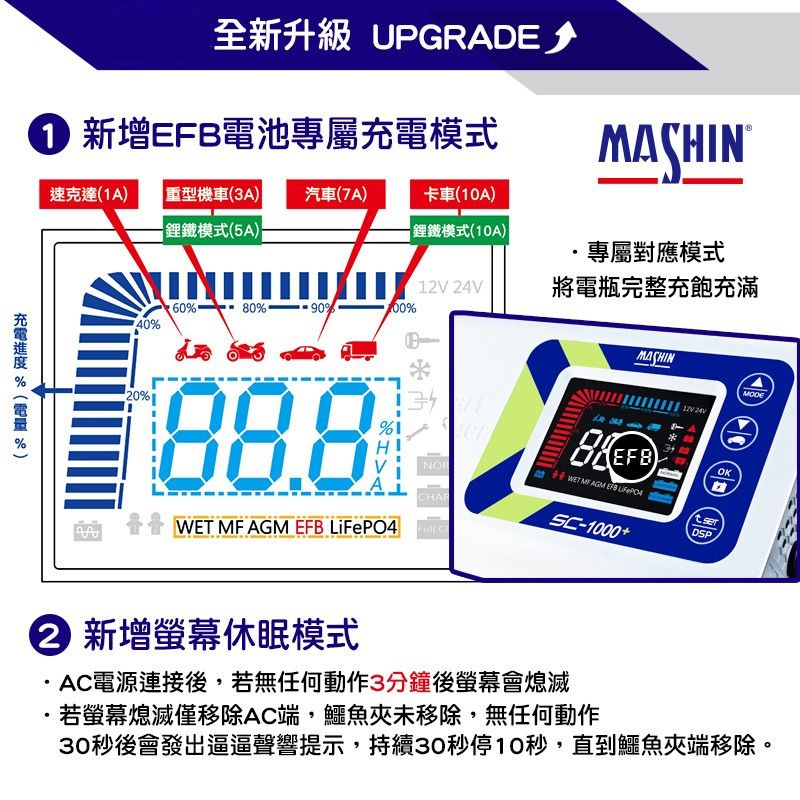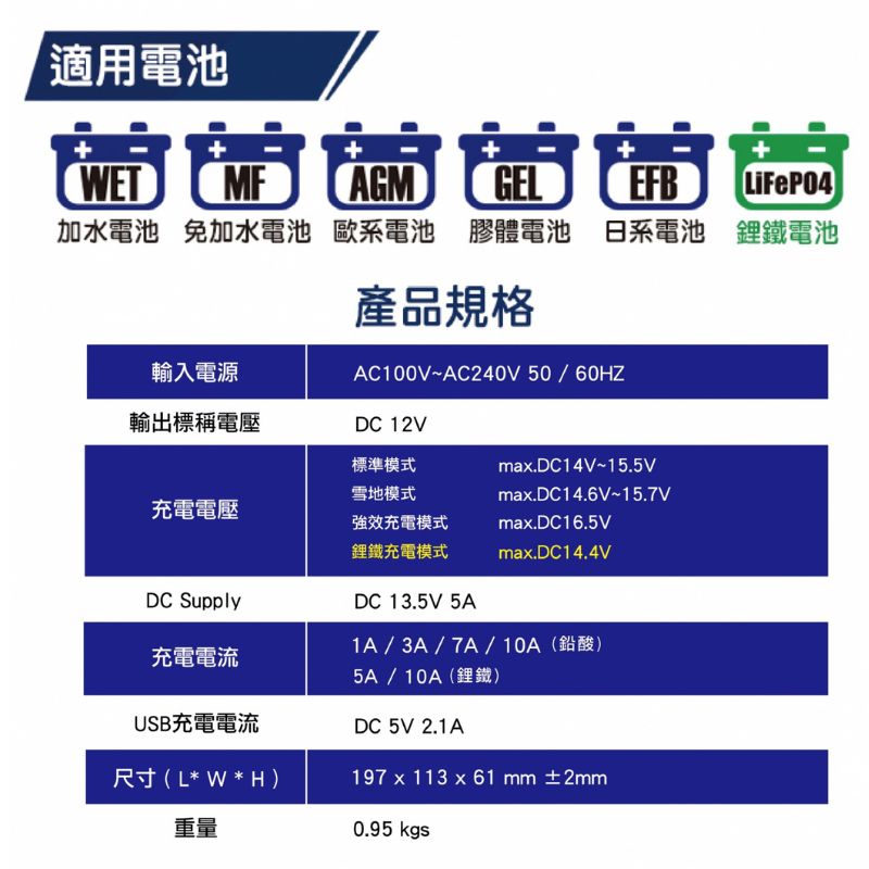 • 適用鉛酸/鋰鐵電池/行動裝置