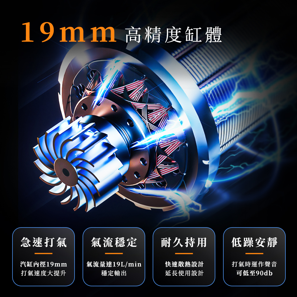 ► 19mm 大汽缸|充氣效率提升50% ► 6.5分鐘完成15吋輪胎充氣