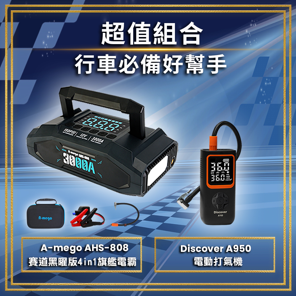 結合 AHS-808 旗艦級救車打氣機與 A950 高效打氣機, 打造「救車 × 打氣 × 照明 × 充電」全方位行車備援方案。